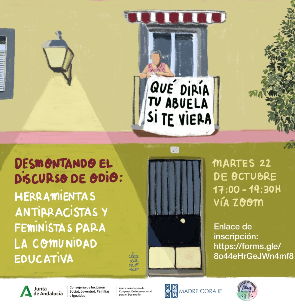En octubre de 2024 ilustré el cartel de la jornada ‘Desmontando el discurso de odio: herramientas antirracistas y feministas para la comunidad educativa’ para el área de educación de Madre Coraje; además de impartir una ponencia feminista bajo el título ‘Qué diría tu abuela si te viera’. La charla online fue dirigida a los docentes que buscan implantar soluciones a comentarios machistas que se vierten en el aula.