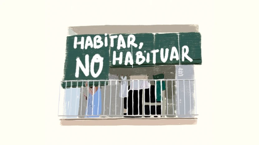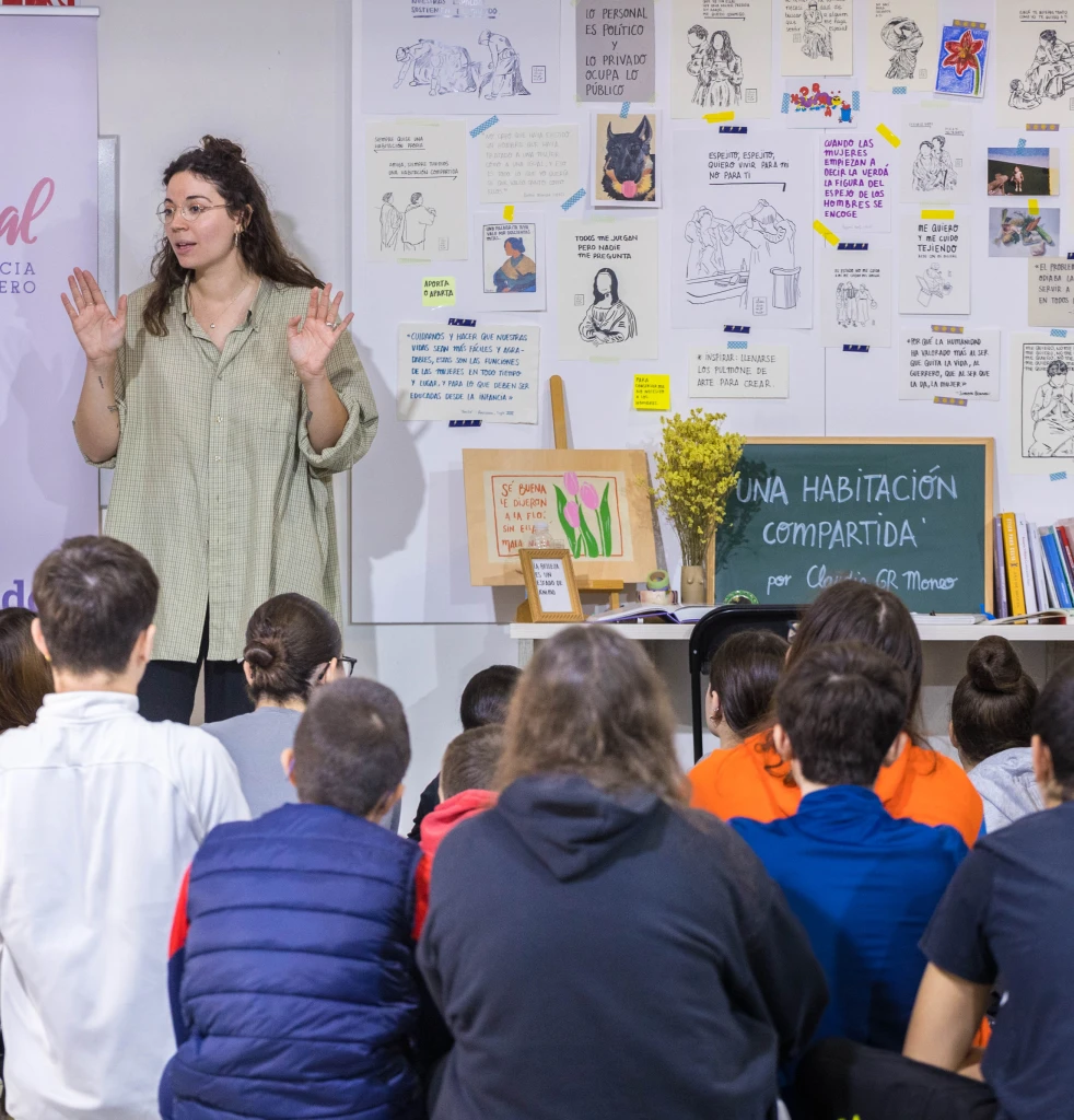 Una habitación compartida es un laboratorio de diálogo dirigido a escolares y personas mayores que recrea la pared del dormitorio de una adolescente como espacio de reflexión desde una perspectiva de género. A través de ilustraciones, palabras y citas, se señalan situaciones de desigualdad que muchas mujeres comparten como la invalidación, la baja autoestima o la dependencia emocional con el objetivo de generar debate, cuestionar hábitos y abrir espacios de diálogo colectivo.