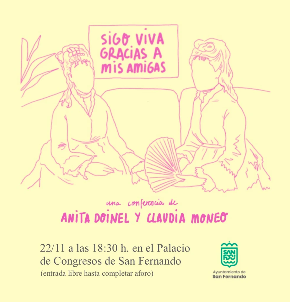 ‘Sigo viva gracias a mis amigas’ es una conferencia que la ilustradora y activista Anita Doinel y yo impartimos el 22 de noviembre de 2023 en el Palacio de Congresos de San Fernando, con motivo del 25N, Día Internacional para la Eliminación de la Violencia contra las Mujeres. En este encuentro, ambas exponemos las grietas de la violencia y los pilares de la sanación, a través del arte. Con el objetivo de abrir un espacio de diálogo/ espejo a través de nuestras experiencias personales relatadas en ilustraciones nuestras.