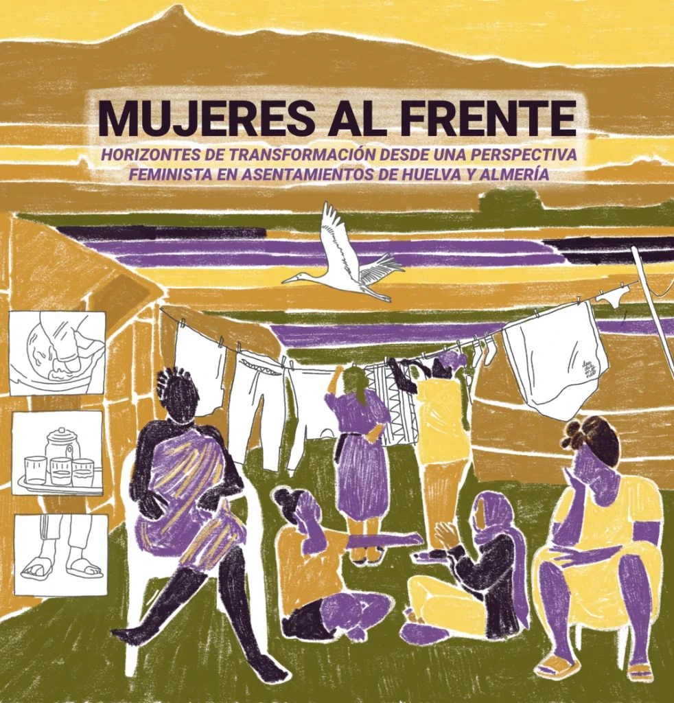 Ilustración de portada y de cuatro bloques (en el interior) del informe ‘Mujeres al frente. Horizontes de transformación desde una perspectiva feminista en asentamientos de Huelva y Almería’, para la organización Mujeres en Zonas de Conflicto (MZC). El informe se publicó a principios del 2025, en formato libro impreso.